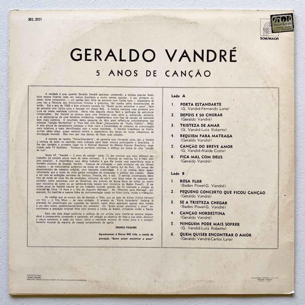 Discover the essence of Brazilian music with the LP "5 Anos De Canção" by Geraldo Vandré. Released by the label Som Maior in Brazil, this vinyl captures the depth and emotion of Vandré's compositions, one of the country's most influential artists. Perfect for music lovers and record collectors, this album allows you to experience the cultural richness of Brazil through songs that defined an era. Get it now and enrich your collection with an authentic piece of Brazilian popular music.